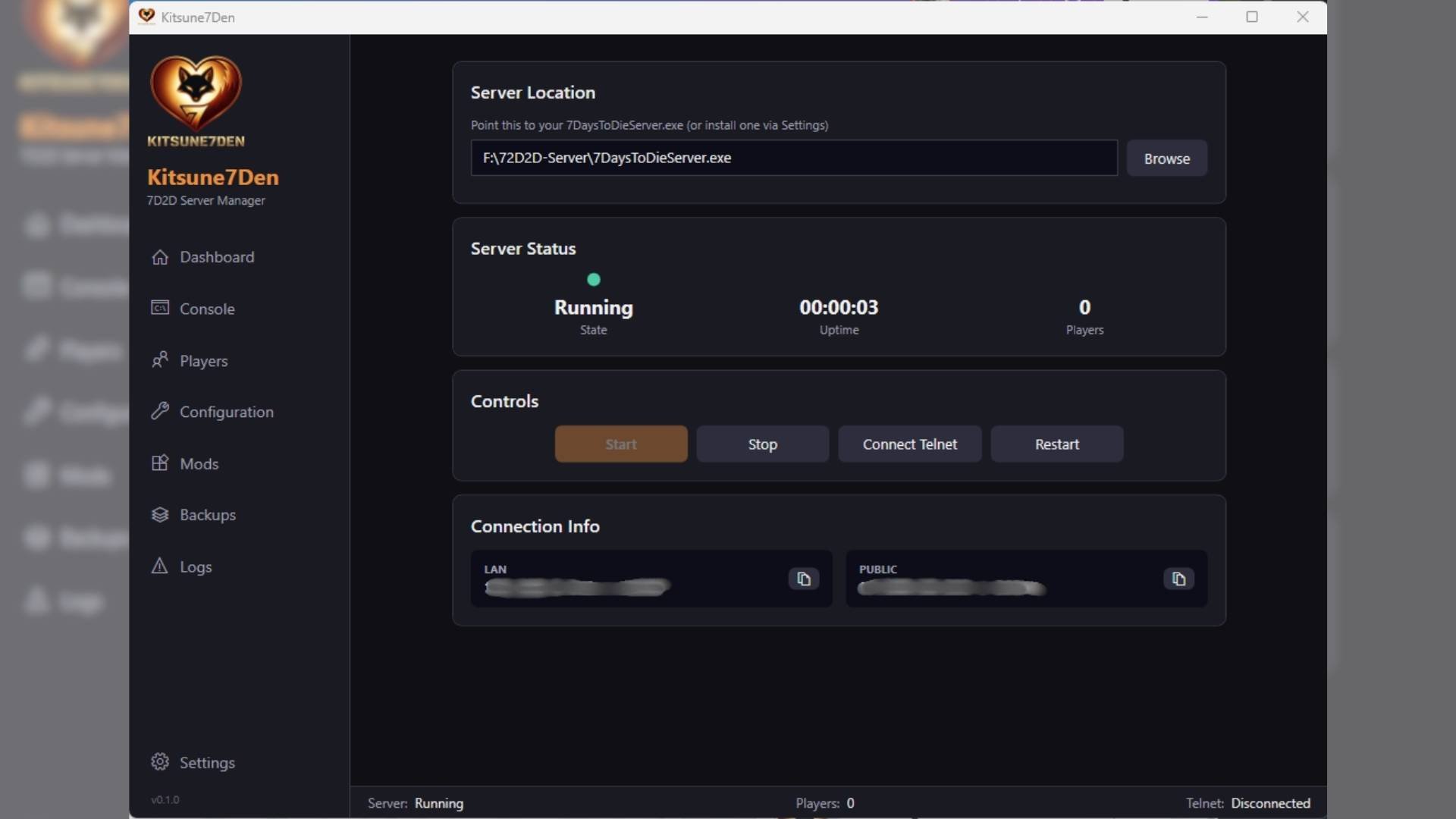 - Dashboard -- Start/stop/restart server, connect telnet, view LAN/public IPs with click-to-copy