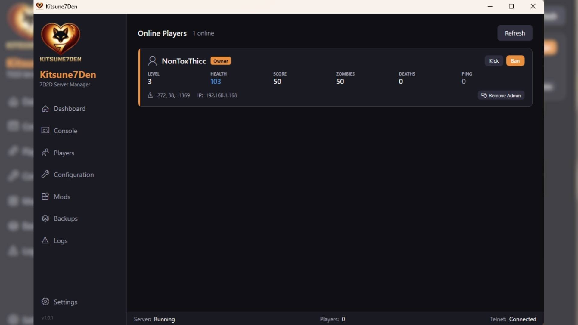 - Players -- Player cards with stats, admin badges, kick/ban, give/remove admin via serveradmin.xml