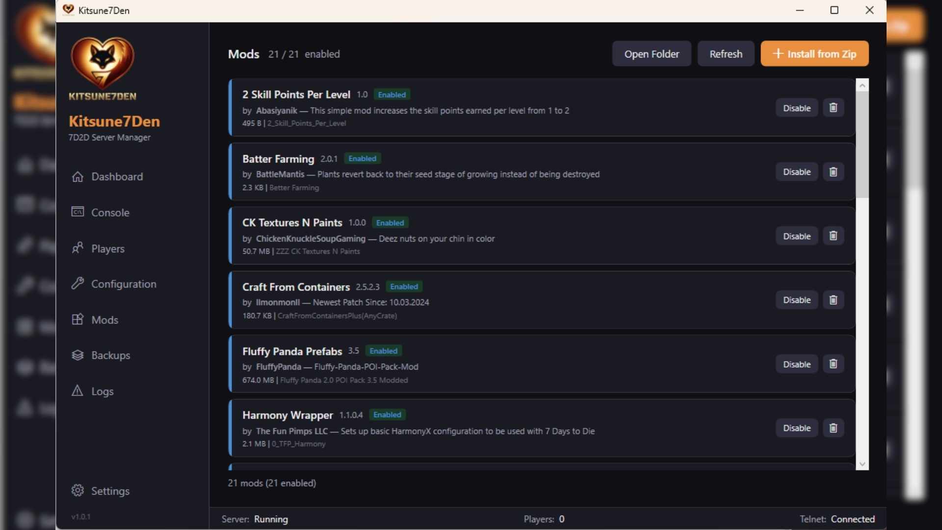 - Mods -- List installed mods, enable/disable, delete, install from zip