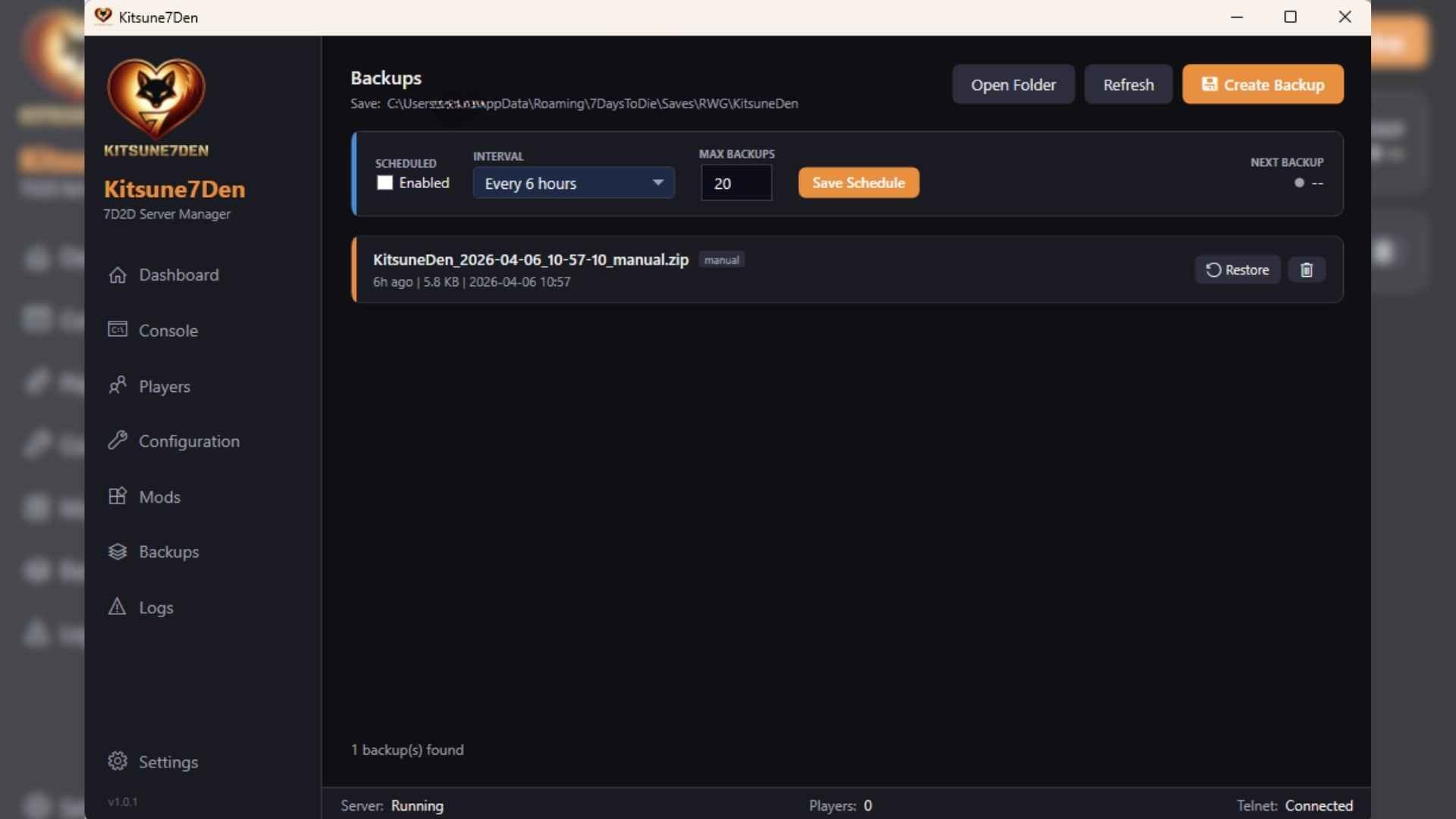 - Backups -- Manual + scheduled backups, restore with automatic safety backup, auto-prune